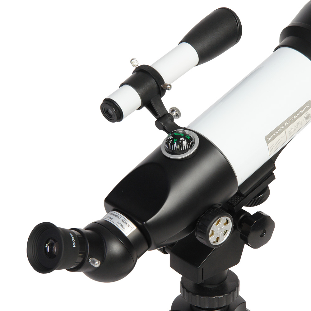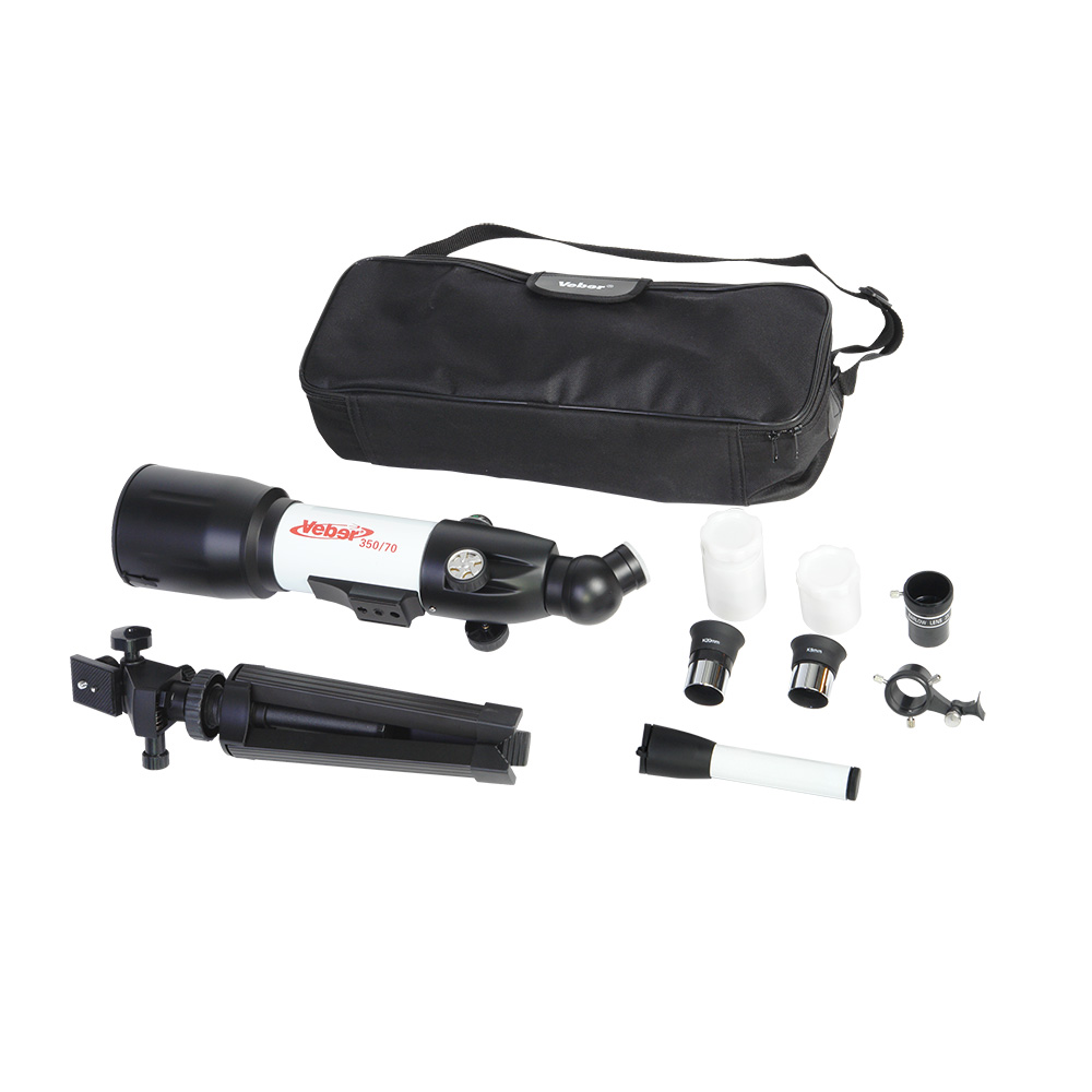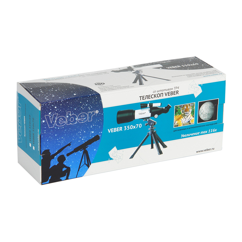 Компактный телескоп-рефрактор. Удобен как для домашних астрономических (и не только) наблюдений, так и для вылазок на природу. Его длина всего 45 см, он легкий и компактный. При этом этот телескоп вовсе не детская игрушка! Его ахроматическая оптика дает хорошее, четкое, резкое изображение без окрашенности по краям поля зрения. С набором окуляров, входящих в комплект, можно получить увеличение от 17,5х (ближняя точка фокусировки ок.5 м) до 116,4х. Veber 350×70 собирает света на 35% больше, чем аналогичный телескоп с диаметром объектива 60 мм. На практике это значит: при дневных наблюдениях — хорошая картинка будет и в ближних сумерках, при ночных наблюдениях — картинка будет более резкой.