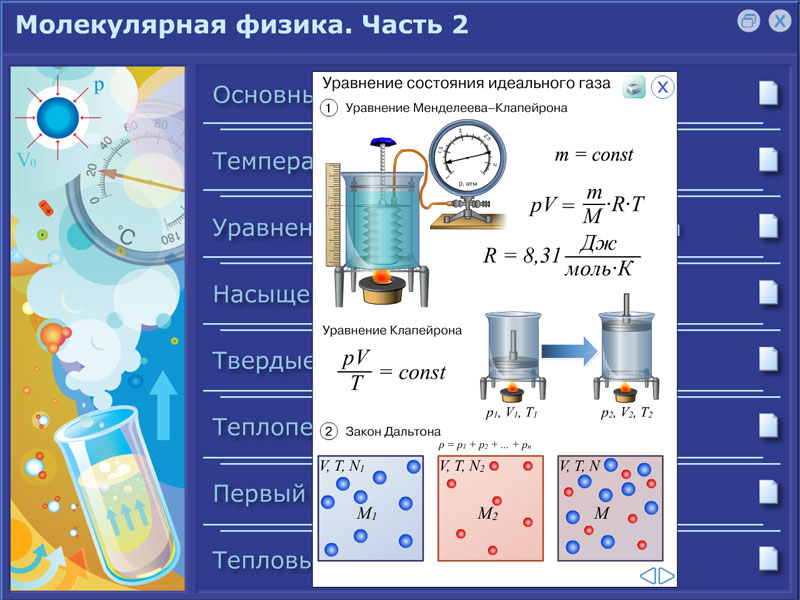 Электронное издание включает набор интерактивных плакатов по молекулярной физике для учащихся 10–11 классов.