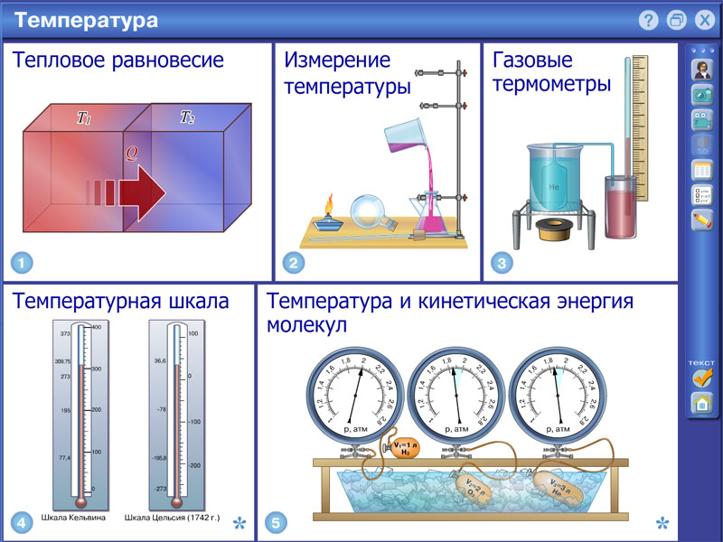 Программа включает в себя 8 интерактивных плакатов по темам: «Основные положения МКТ», «Температура», «Уравнение состояния идеального газа», «Насыщенный пар. Влажность», «Твердые тела», «Теплопередача», «Первый закон термодинамики», «Тепловые машины».