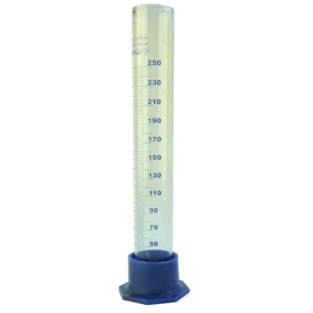 Объем - 250 мл. Материал - полипропилен. Диаметр - 42 мм. Высота - 300 мм. Объемная шкала. Цена деления - 2 мл. Первая отметка - 20 мл.