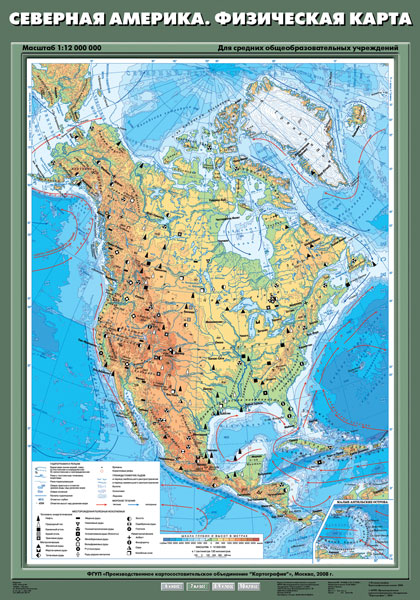 К-0720 - Северная Америка. Физическая картаМасштаб 1:12 000 000, Формат 100х140 см.