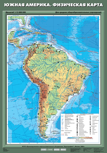 На карте изображены гидрография и рельеф Южной Америки, морские течения, месторождения полезных...