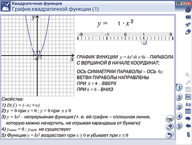 Интерактивное учебное пособие разработано с учётом ФГОС и примерной программы по математике основного и среднего общего образования. Материал интерактивного учебного пособия «Наглядная математика. Графики функций» содержит темы учебных курсов по алгебре 7-11 классов.