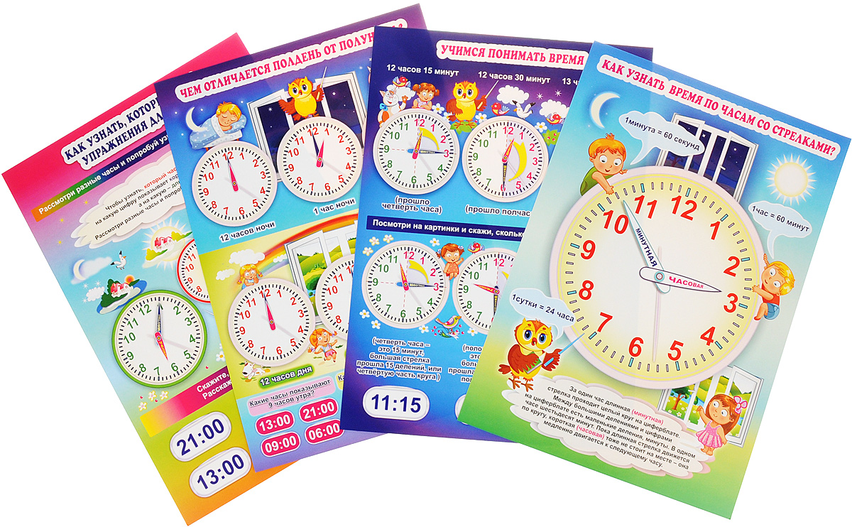 Подчеркните, что знать время важно, чтобы никуда не опаздывать. Научить ребенка определять время поможет комплект плакатов "Изучаем время". Комплект включает 4 плаката: