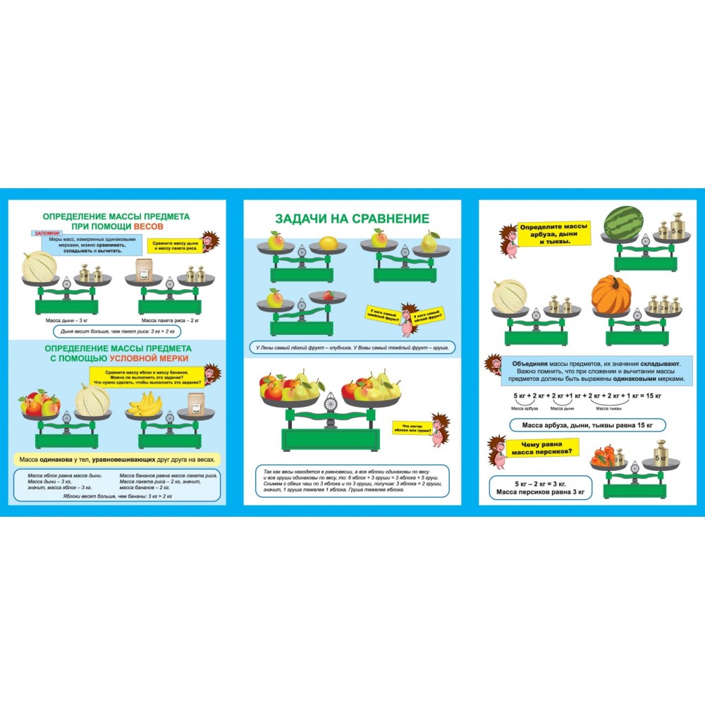 Раскладной плакат из 9 секций для организации и проведения занятий с обучающимися 1- 4 классов по изучению и закреплению темы "Меры массы" в урочной и внеурочной деятельности и содержит информационный материал: