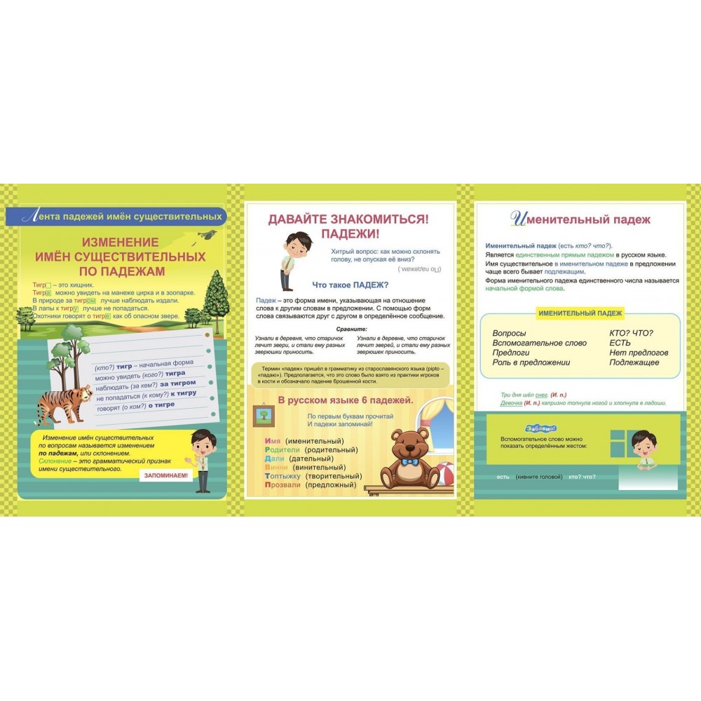 Раскладной плакат из 9 секций для организации и проведения занятий со школьниками по изучению, закреплению и повторению темы о падежах в урочной и внеурочной деятельности, содержит материал об интересных фактах падежей русского языка:
