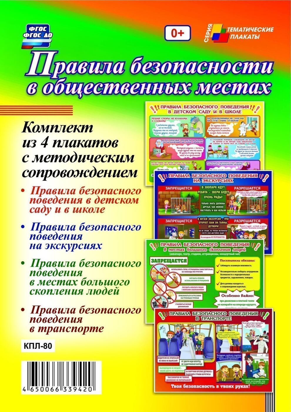 Комплект включает 4 ярких, красочных плаката:1. Правила безопасного поведения в детском саду и в школе. 2. Правила безопасного поведения н...